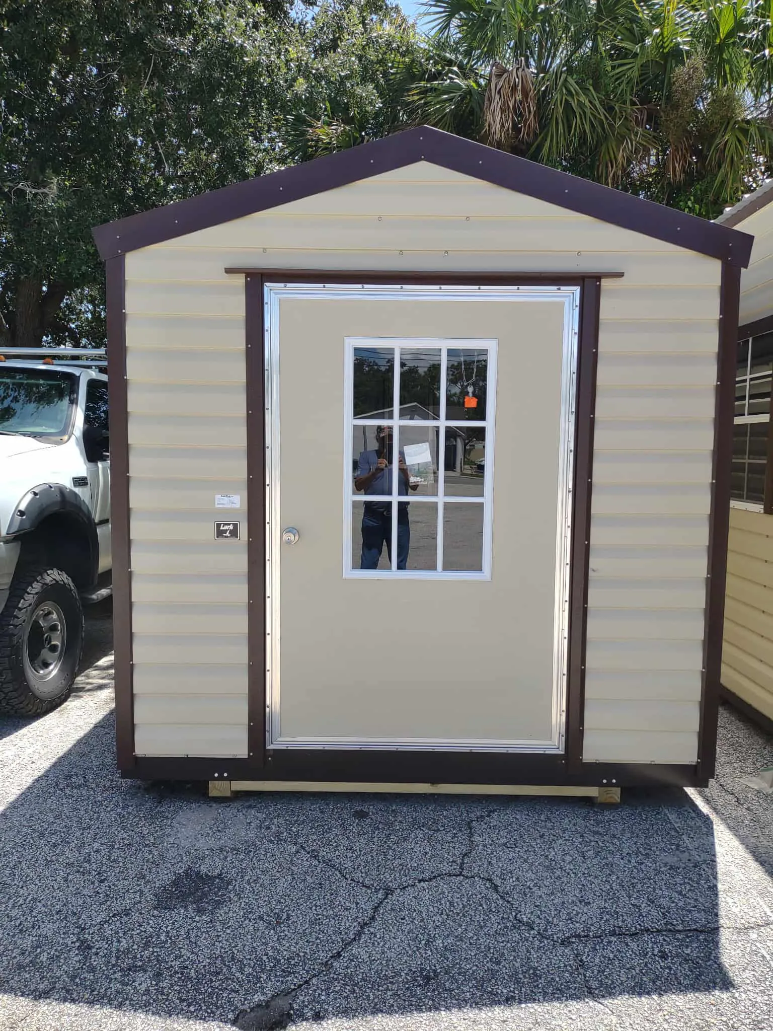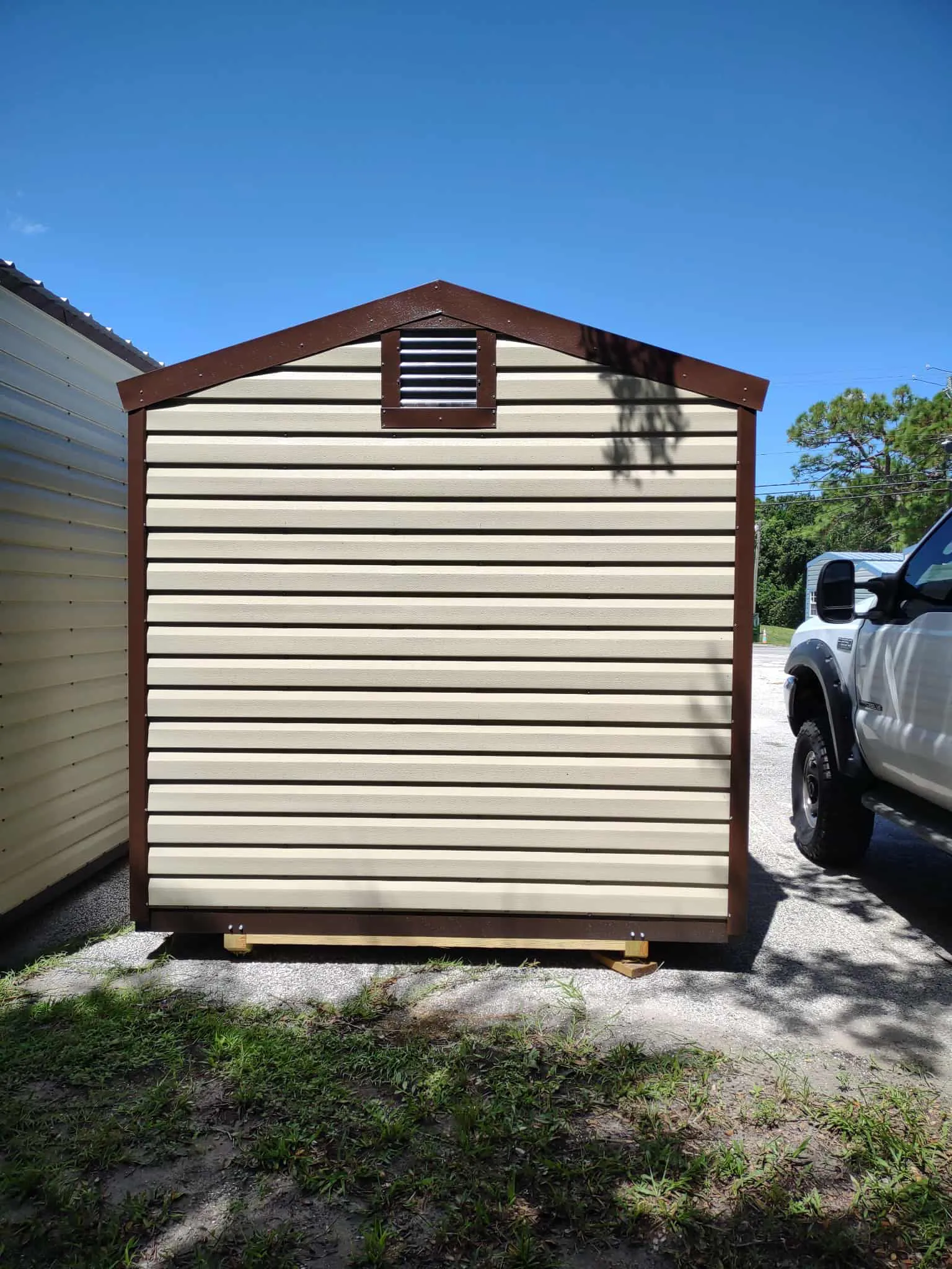 On the lot! New 8 x 10 Lapsider endgable with antique beige siding and brown trim. 46 x 72 door with a 9-lite window, 1 vent, and 1 light/outlet.