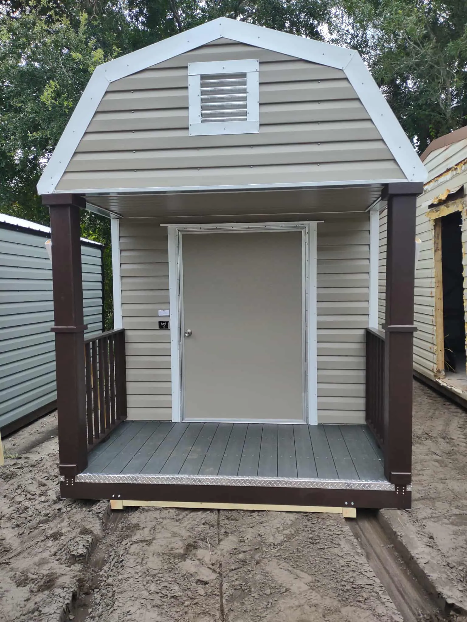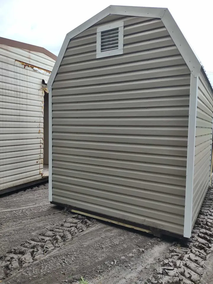 On the lot! This is a new 8 x 14 Lofted barn with a 4 ft porch. Clay siding with white trim. Has 2 vents 1 light/outlet 4 x 8 loft. 46 x 72 door.