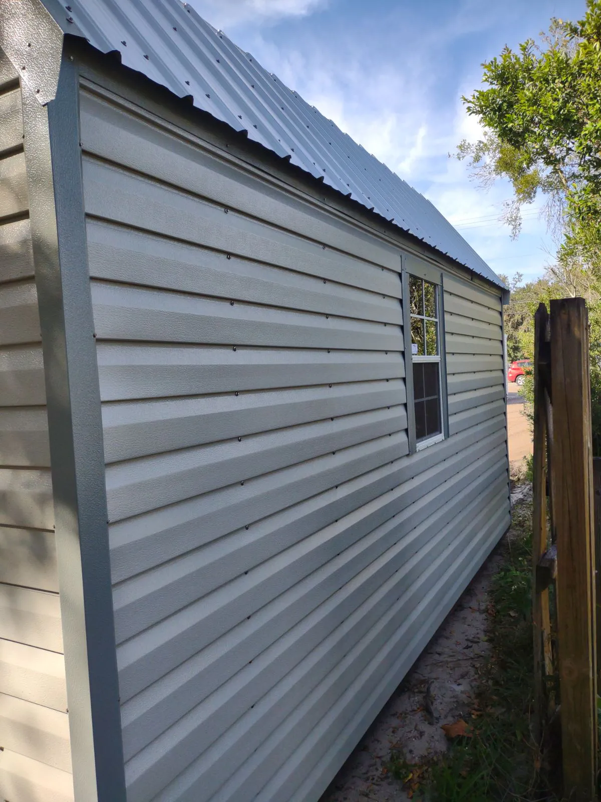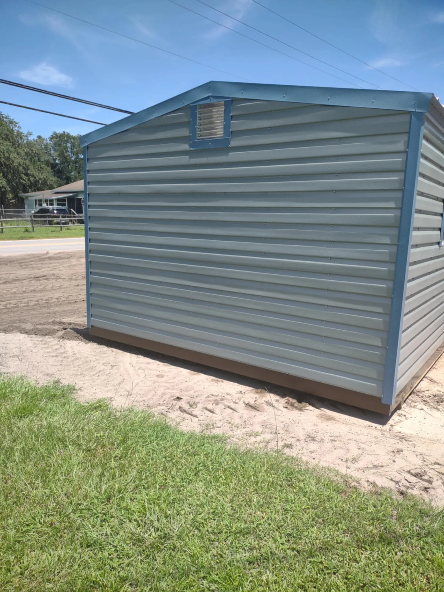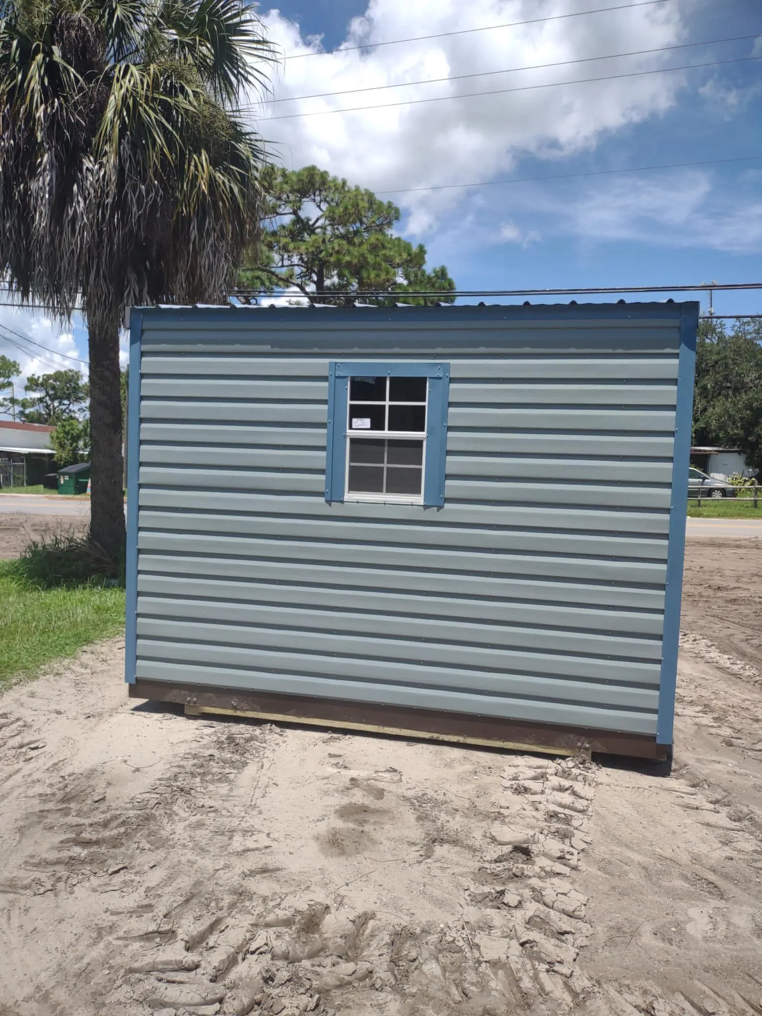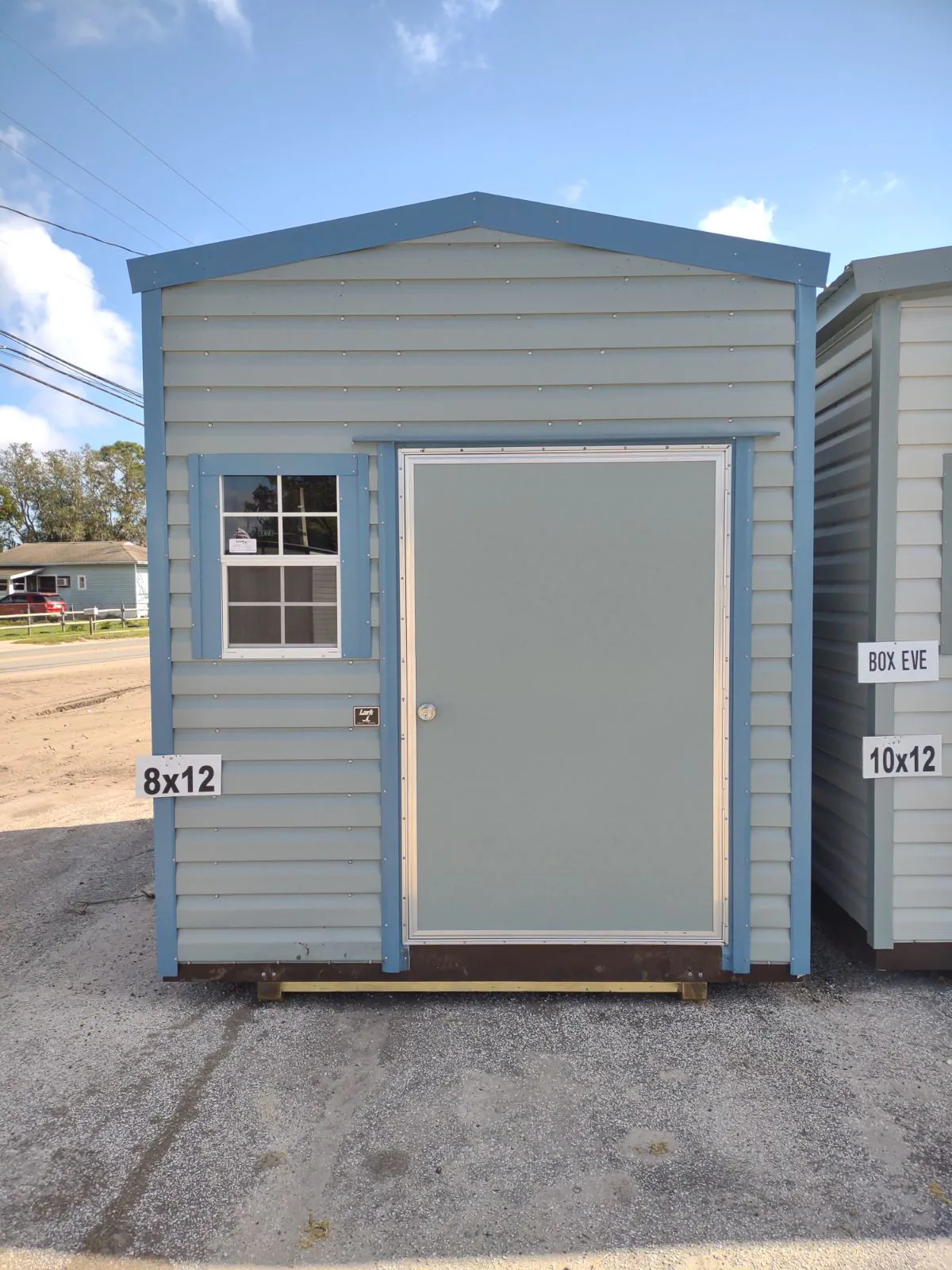 10 x 12 Lapsider Sidegable Dove siding and blue trim. 1 window, 1 vent, 1 light/outlet and a 46 x 72 with a 9 lite window.