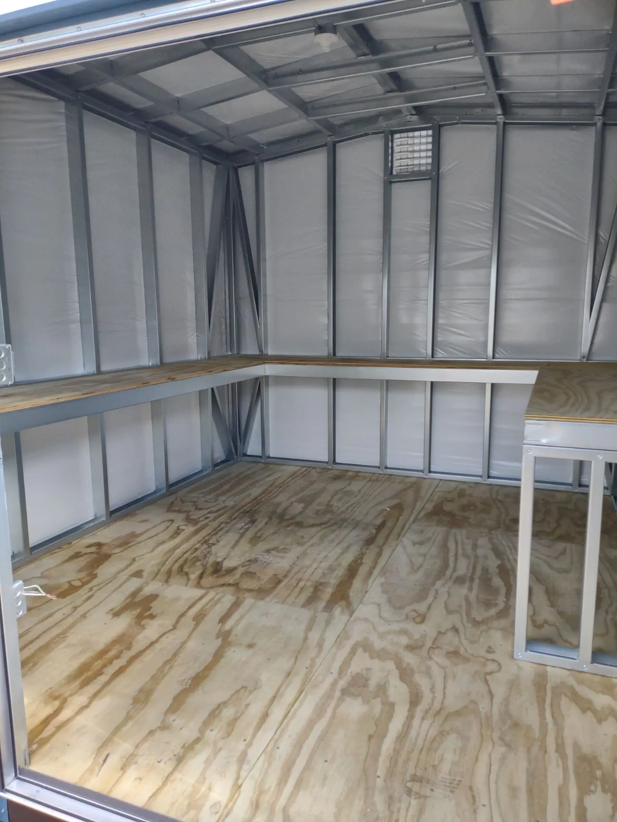 On the lot! Here's a good looking 10 x 12 Lumberjack Endgable. 60 inch door, 1 window, 1 vent, 1 light and 1 outlet. Work bench as well!
