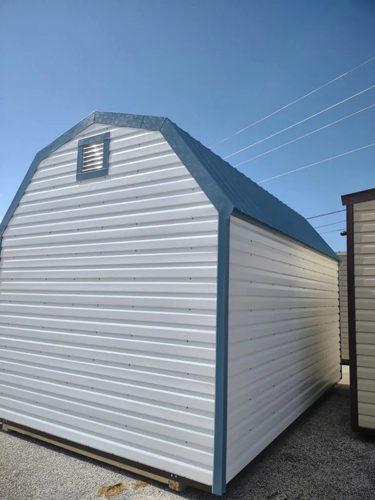 On the lot! New 10 x 16 Lofted barn with White siding, Blue trim and Blue roof. Double doors of 36 x 72. It has 2 windows, 2 vents, 2 lights and 2 outlets.