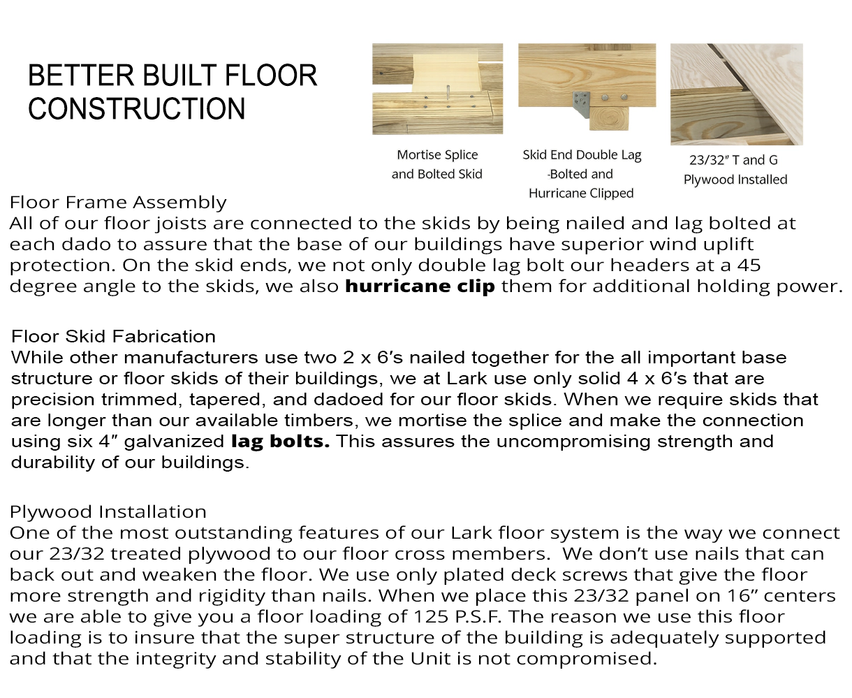 • 20 Year Full Warranty against rot or termites on the entire base from the floorboard down.