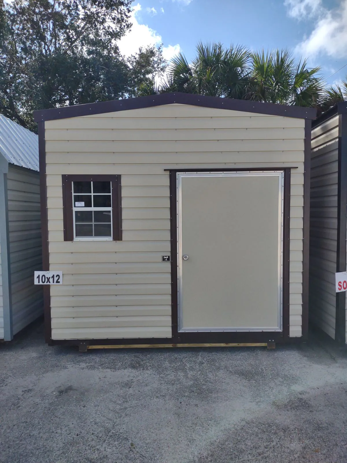 On the lot! Here's a new 10 x 12 Lumberjack Endgable, with a 46 x 72 man door. It has 1 Window, 1 vent, 1 light and 1 outlet.
