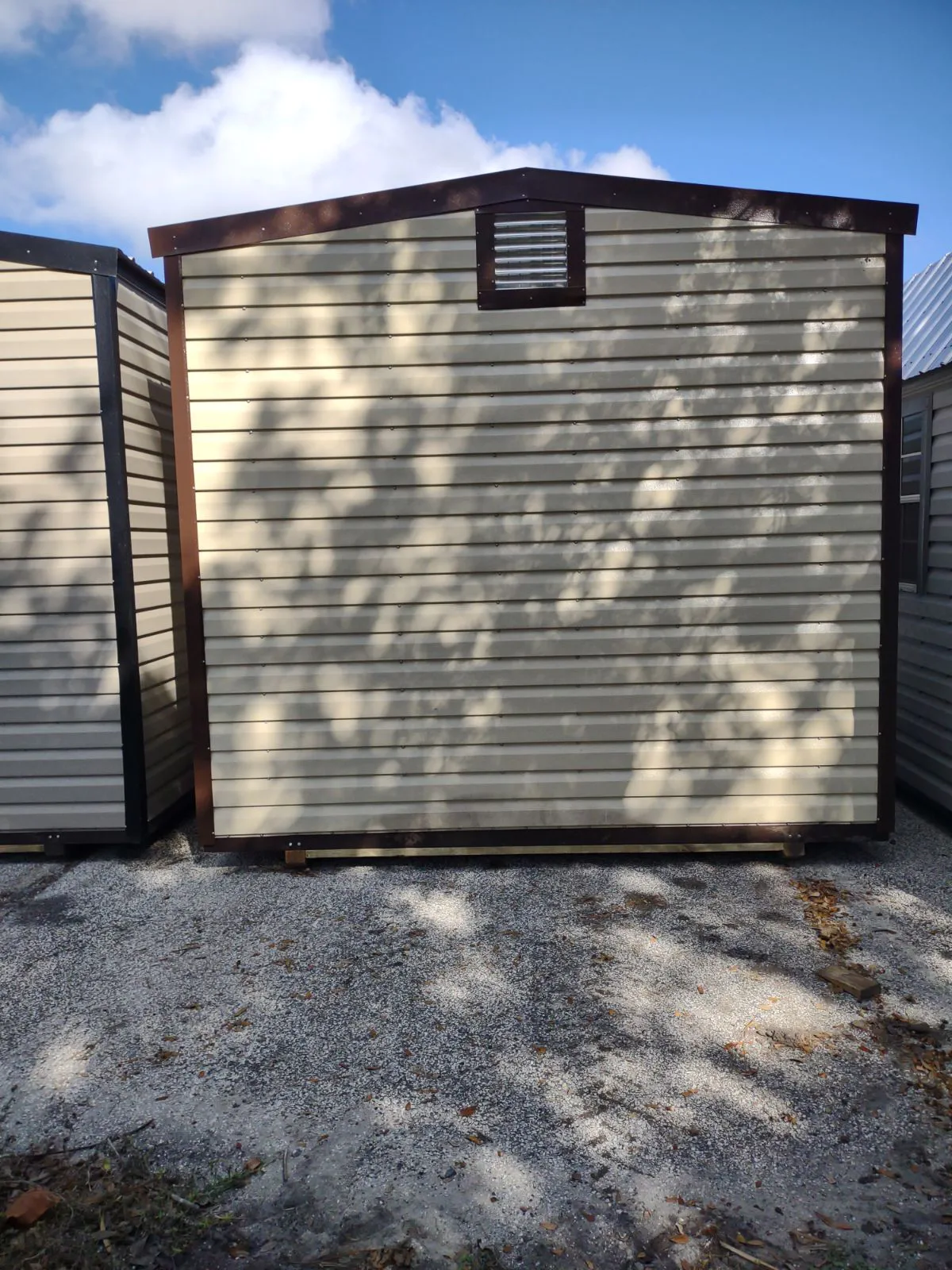 On the lot, here's a new 12 x 24 Lumberjack Sidegable. Double doors 36 x 72 and has 2 windows, 2 vents, 2 lights, and 2 outlets. Antique Beige siding with Brown trim.