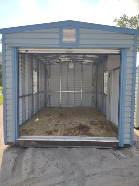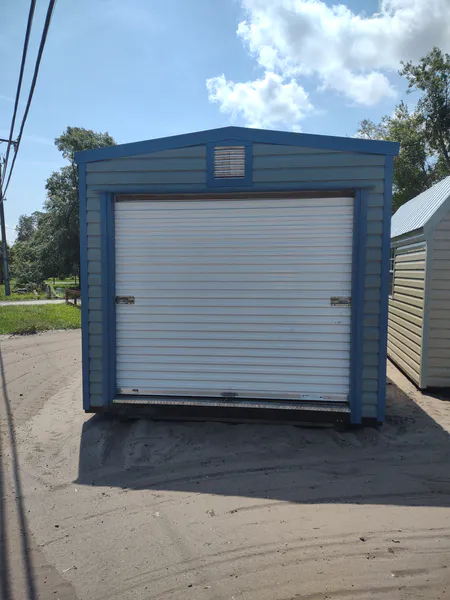 Used 10x16 shed with a 8x7 Roll-up Garage Door, 46" Man Door, and 2 Windows. The shed has 2 Vents, 2 Interior Lights & 2 Electrical Outlets. Dove Siding with Blue Trim. $5530