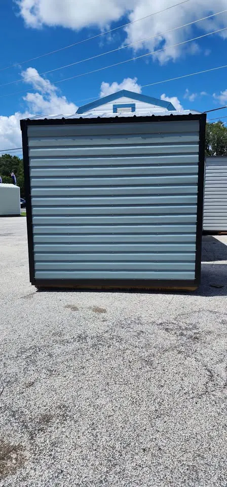 On the lot! New 10 x 16 Lofted barn with White siding, Blue trim and Blue roof. Double doors of 36 x 72. It has 2 windows, 2 vents, 2 lights and 2 outlets.