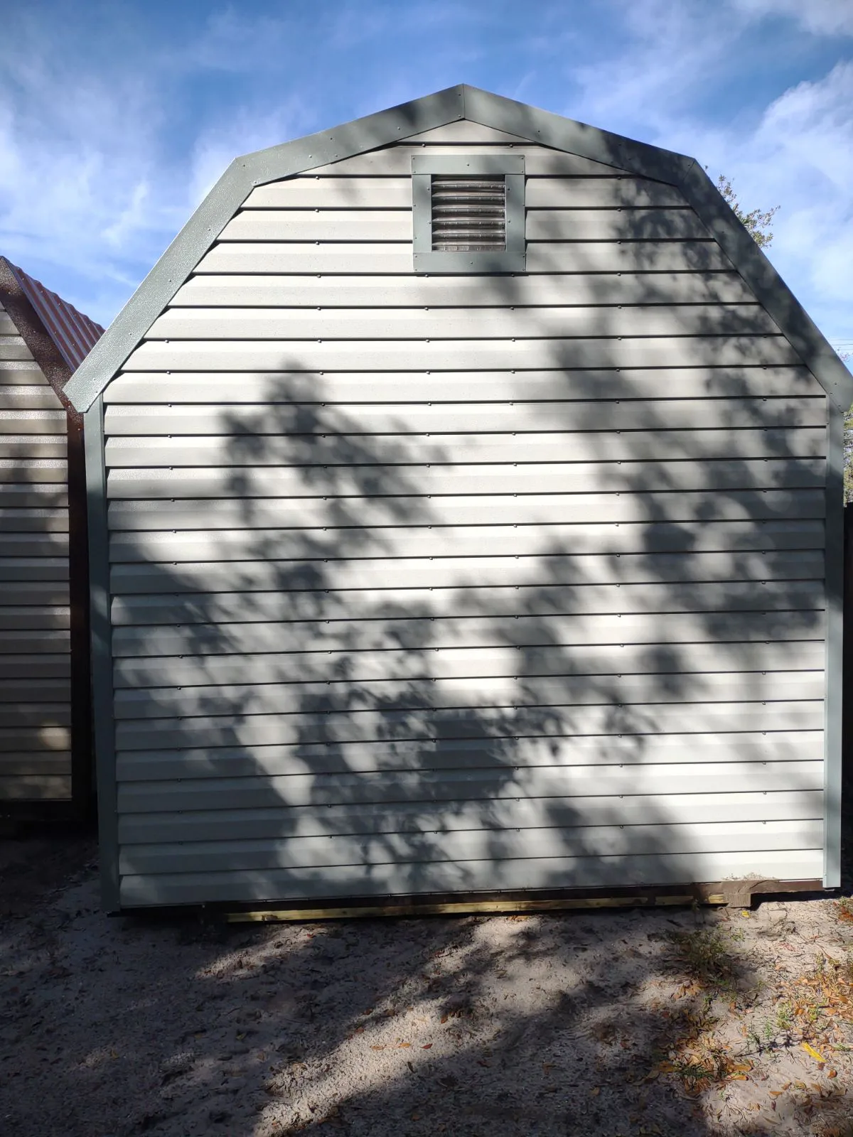 SOLD:On the lot! This is a new 10 x 16 Lofted Barn, with a 46 x 72 Man door. It has 2 windows, 2 vents, 2 lights and 2 outlets. Also a handy 4 x 10 ft loft. Pewter siding with Dove trim.